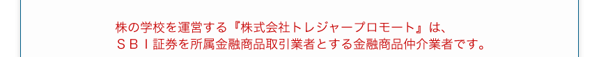 『株式会社トレジャープロモート』は、SBI証券を所属金融商品取引業者とする金融商品仲介業者です。